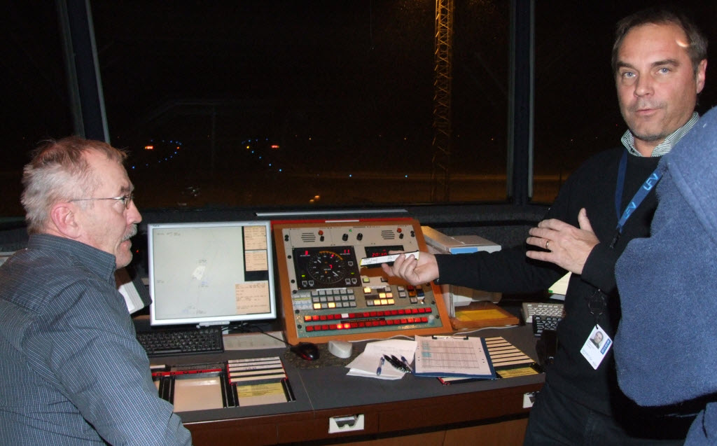 I samband med fikat så delades gruppen upp i 3 smågrupper som fick besöka själva trafikledningstornet. Sista gruppen hade tur att få 'följa' Malmö Aviations flight från 10 minuter innan till och med landningen kl 2200 i snöblåsten. Tom visade till sist hans fysiska mätarbetsplats bredvid det rum som innehöll en hel del av den elektronik han hade beskrivit.