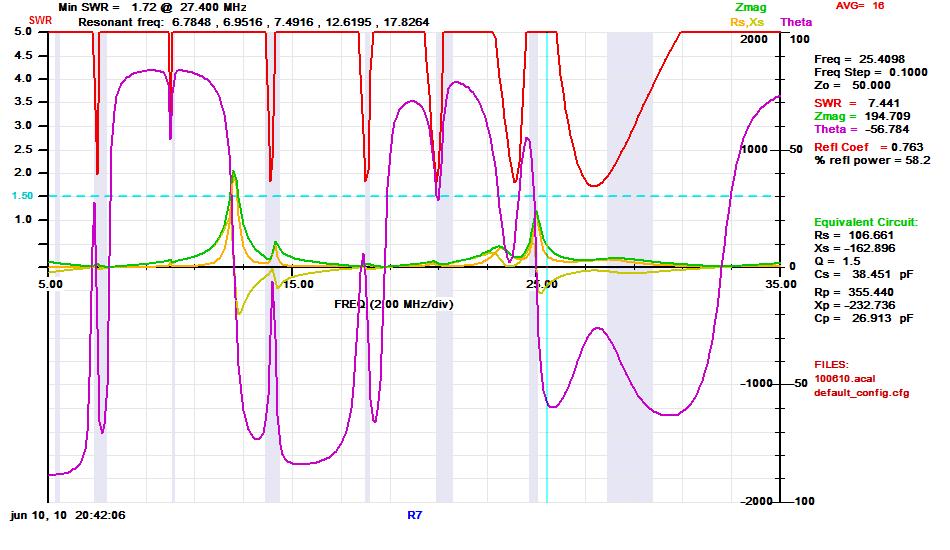 Ett litet gäng tog ut vår R7-antenn och med Tomas SM2XVVs lilla ’svarta låda’ AIM 4170C antennanalysator så kunde vi konstatera att antennen i nuvarande skick inte riktigt fungerar bra på amatörbanden. Det krävs en djupare trimning av alla ingående LC-kretsar för att den skall resonera med våra amatörband. Kvällen avslutades just med att vidstående kurva diskuterades. Man kan se att det finns resonanser, men ingen under 1,5:1 och i stort alla strax utanför våra band.