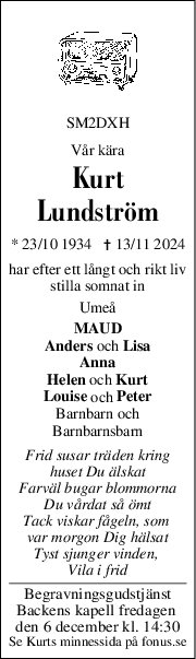 Kurt/SM2DXH avled onsdagen den 13:e november i en ålder av 90 år.